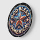 Circular wall clock featuring an American patriotic design with a star motif and 'God Bless America' text in bold. Perfect for expressing national pride in home or office decor.
