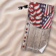 One side of this beach towel features US patriotic bunting in red and white stripes plus a blue field with white stars draped over a wooden slat background. The left side features a row of red, white, and blue stars. Personalize template field with your information, remove it or use the edit design tool to select a font style, size, and color you like.