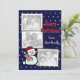 Red white and blue photo flat card for a patriotic Christmas. Snowman holding an American Flag, customize with three photos and your own text.