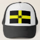 Celebrate Wales' National Day on March 1st or any other day of the year with this bright hat in daffodil yellow and black, the colours of St David's Flag, a yellow cross on a black background. Above the flag lies the Welsh Dragon sihouetted in black; it is the dragon, Y Ddraig Goch, that appears on the national flag of Wales.