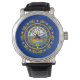 This stylish timepiece proudly showcases the distinctive design of the New Hampshire flag. The watch strap and dial elegantly display the blue field with the state seal centred, surrounded by laurel leaves and nine stars. The state seal features the frigate Raleigh, a sheaf of arrows, and a pine tree, symbolising the state's naval history, preparedness in defence, and natural resources.