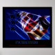 Abstract image of the Navy's blue Angels streaking across a flag filled sky. The word "Patriotism" and a definition of the word.