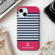 Personalize this cute Navy and White Striped Nautical Print Phone Case with your name on a red background. The design features a modern white script typography on a red background. The example is for an iPhone 15 model, but it will fit other models on Zazzle. Please verify before purchasing.