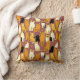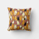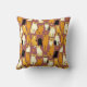 Pillow in a playful pattern of stylised cats in warm shades of ginger, cream, black, and brown on a caramel brown background. Each cat has its own cute expression and markings, with little paw prints scattered throughout.