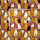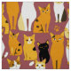 Fabric in a playful pattern of stylised cats in warm shades of ginger, cream, black, and brown on a caramel brown background. Each cat has its own cute expression and markings, with little paw prints scattered throughout.