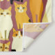 Tapestry in a playful pattern of stylised cats in warm shades of ginger, cream, black, and brown on a caramel brown background. Each cat has its own cute expression and markings, with little paw prints scattered throughout.