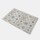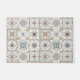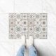Door mat / rug with a series of nine (9) different Spanish-style tiles in neutral coloured, mosaic pattern.