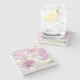 The coasters are gorgeous, a quality feel and heavy weight. They look like a precious archeological find. A rustic stone juxtaposed with a modern floral black and white print. I like the way the print goes slightly imperfect on the cut stone edges giving them a kind-of natural beauty.