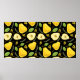 Pattern with sweet yellow pears with leaves, flowers, branches. Organic healthy fruits on black background. Hand drawn overlapping backdrop. Cartoon illustration