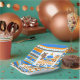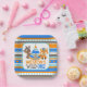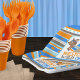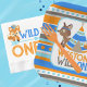 Patterned Wild One First Birthday Paper Plates in Blue, Orange, Tan and Brown. Featuring an adorable forest fox, deer and tribal inspired teepee tent. Part of our "Wild One" collection, but also works great for a "One Happy Camper" theme!