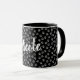 Paw print mug with name. Grey paw print pattern on black background and white custom name. Personalise by replacing the sample name Nicole with your own name or custom name or text of your choice. Awesome personalised gift idea for a cat mum, dog owner or any other pet animal lover.