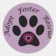 A paw print with hearts on a purple background promotion animal rescue, adoption and fostering.