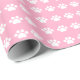 This gift wrap displays a pattern of white paw prints on a pink background. This is a great item for paw print themed, dog themed, cat themed, or animal themed baby showers.