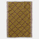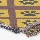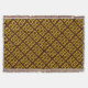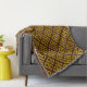 This throw blanket features a geometric abstract pattern of paw prints in gold, yellow, brown and black diamond squares