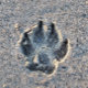 A dog pawprint in the sand on the beach.