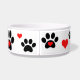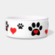Show your doggy your love with this custom designed dog bowl! Design features black paw prints and red hearts!