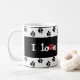 "I love my dog," says it all. This mug reminds me of who loves me and is always a loyal and giving friend; my dog! 2 bands of black paw prints on a white border circle around the text with a special, red, paw prints heart in the message.