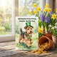 Celebrate St. Patrick’s Day with four-legged charm. This adorable watercolor greeting card features a happy terrier pup prancing through a sunny meadow, wearing a festive green leprechaun hat and shamrock necklace.