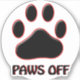 A graphic design of a dog paw print with the text “Paws Off" by artist/designer Charmaine Paulson on a variety of products.