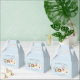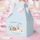 Cute favour box for your child's puppy theme birthday party. Illustration of 4 dogs (dalmatian, beagle, pit bull terrier) with party hats. The text says "thank you for coming to my pawty." Customise this product by adding your child's name at the bottom of the design.