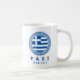Paxi, Greece coffee mug featuring the national flag of Greece inside a Greek key pattern blue circle design. This mug is perfect for you to enjoy drinking your coffee while you are on vacation in Paxi, Greece or if you are proud to be from Paxi.