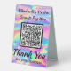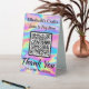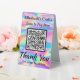 Pay Here QR Code Iridescent Rainbow Hologram Effect Table Tent Sign. Easily personalise the business name and other text fields, insert your own qr code, and your unique business supplies are ready. Faux iridescent hologram effect checkout signs are great for craft booths and market stalls geared towards girls, teens and ladies. Add additional business contact info in the template area on the back.