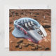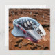 A futuristic, computer mouse-shaped spacecraft rests on the red, dusty surface of Mars. The mouse-like craft is white, streamlined, and resembles a miniature space shuttle. Small wings are positioned on its sides, red indicator lights shine beneath it, and on top, a transparent dome allows a clear view of the empty pilot seat – indicating that the crew has already disembarked.