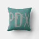 Throw pillow features PDX - Airport abbreviation for Portland International Airport, Portland, Oregon. Grungy urban grey text on teal background