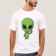 A cute green alien stands cheerfully against a deep black background, flashing a friendly peace sign. Its oversized head, smooth round shape, and large glossy black eyes give it a playful, approachable personality. Subtle highlights and clean outlines create a polished cartoon look, while the simple pose and bright green color make the character feel lighthearted and fun. The overall illustration blends sci‑fi charm with adorable kawaii style.