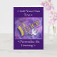 The word "Peace" is painted in a soft golden yellow against a pink and purple background. A dove of peace holds an olive branch in its beak. The watercolor painting has a textural contrast and sparkle from a light layer of glitter. The inspirational word painting series are taken from the text used in the angel paintings. "I choose to embrace peace" -My Life, My Choice "In my life I choose to welcome my peace" -Feel Beauty "It cannot destroy peace" -What Cancer Cannot Do These images are designed so as to provide reflection and meditation on a single word. You can also combine them together to make your own word series for meditation/ contemplation. Personalise this card with your own text and images. Use the "Customise" button to make your changes.
