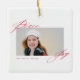 Modern holiday or christmas ornament featuring a single photo within a white frame with elegant and modern script calligraphy in a simple layout with front and back design.