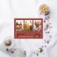 Simple and chic "Peace and Joy" holiday photo card features a collage of 3 portrait photos on a horizontal card layout with white twinkling stars and cute and modern hand-lettered calligraphy script text with heart accent in real gold foil. Personalize the greeting, family signature, and year on the front, and choose to include an additional message on the back of the card. An additional landscape photo space is included on the back. Cinnabar orange red background color can be modified.