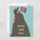 Peace and Love wishes. A climber with a peace symbol flag at the top of a mountain