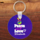 A funky cool personalised keychain with peace and love written in a groovy typography font. The illustration is a hand-shaped peace symbol, fingers raised in the classic v sign all made in rainbow colours. A little doodle heart beside the word love. Psychedelic groovy design. Acid purple background.