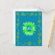 Lime Green/Yellow: Used for the central sun-like graphic and the text overlay, this vibrant colour adds energy and serves as a focal point.