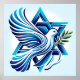 This stunning piece features a graceful dove in mid-flight, its wings outspread and a vibrant green olive branch held delicately symbolising hope. The dove, rendered in soft white tones, contrasts beautifully against the backdrop of a bold, solid blue Star of David, which captures the eye and heart with its depth and significance.