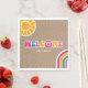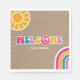 Groovy baby shower theme featuring peace sign incorporated into "Welcome" text with custom text for name. Sunshine at top left and rainbow at right over cardstock inspired sunburst background.
