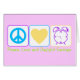 'Peace, Love and Daylight Savings' features a blue peace symbol, a yellow heart and a purple alarm clock. All decked out in Spring colours, this design celebrates that extra little bit of daylight.