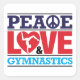State what's really important to you with this sticker featuring the words "Peace, Love, and Gymnastics". The letter "c" in the word peace is substituted with a peace sign, while the heart standing in for the letter "O" in love, contains a silhouette of a girl mid-handstand. Available with matching products.