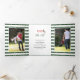 Peace love and joy, trees and ornaments green Tri-Fold Holiday Card. The cover of this card features the text "Peace love and joy" in red and green along with a photo collage of four photos. The corners are covered with Christmas balls, a truck and trees. The flap showcases a photo of your family with the same graphics. The left and right inside display a pattern of stripes and polka dots-snowflakes in green and white with a photo on each one. Photography © Storytree Studios, Stanford, CA