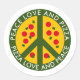 Peace Love and Pizza funny custom party favour Classic Round Sticker. Cute peace symbol sign with pizza point slices. Make your own custom party supplies for kid's Birthday, wedding, gathering, meeting, celebration, BBQ and more. Add your own personalised text. Italian cuisine food design with humourous quote. Also great for chef, cook or pizza maker in pizzeria restaurant.