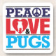 Declare your favourite dog breed with this item featuring the words "Peace, Love, and Pugs". The letter "c" in the word peace is substituted with a peace sign, while the heart standing in for the letter "O" in love, contains a silhouette of a pug. Available with matching products.