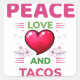 Bright and Playful Design: Featuring bold colours and a heartwarming message, this sticker combines peace, love, and tacos in a delightful and eye-catching design.