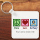 This cool custom archery club keychain features a peace sign, heart, and archer holding a bow and arrow. The perfect personalised gift for an archery teacher at a training centre who provides lessons.