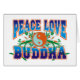 Peace, Love Buddha! Very colourful Buddhism design in green, blue, white and orange colours. Flowers and leaves in the centre with the well known Yin Yang symbol. Peace and Love text above and Buddha text below! Wonderful Buddhist shirts and gifts!