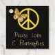 Large yellow peace symbol that is recognised around the world, with yellow butterfly overlay on black background. "Peace love & butterflies" text is customisable