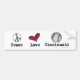 In 2010, it's all about Peace and Love in Cincinnati. Celebrate Cincinnati with a cool Peace Love Cincinnati bumper sticker! Design features a peace sign, heart and (or course) a baseball. Fun gift idea!