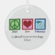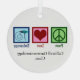 Peace Love Endoscopy Christmas ornament with your personalised text. A cute gift featuring a peace sign, heart, and endoscope used in medical procedures to scope a patient.
