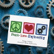 A cool engineer holiday card with a peace sign, heart, and gears. Cute Christmas cards for an engineering company. Peace Love Engineering.