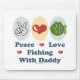 Peace symbol, heart and fish on baby, infant and kids apparel, clothing, stationery and more fishing theme merchandise that make a cute gift for the child of an avid fisherman. An outdoorsman father is sure to love to seeing his son or daughter wearing this cute Peace Love Fishing With Daddy design.
